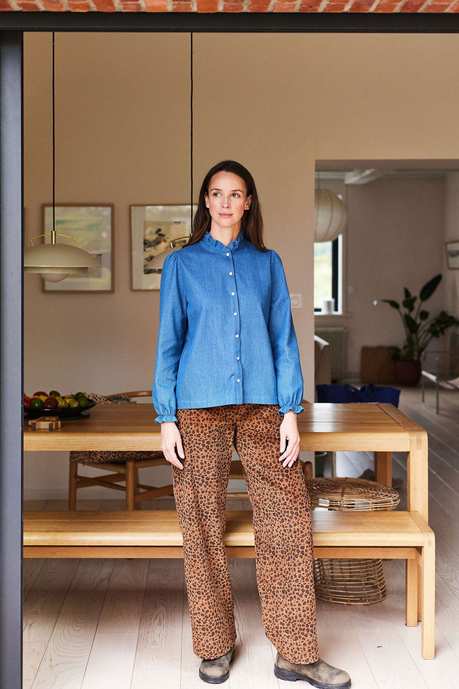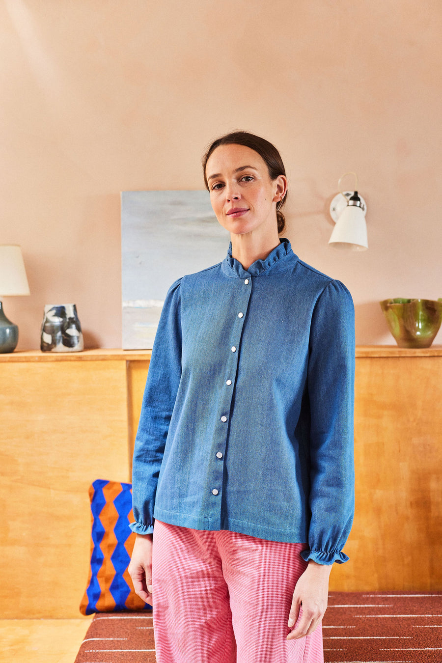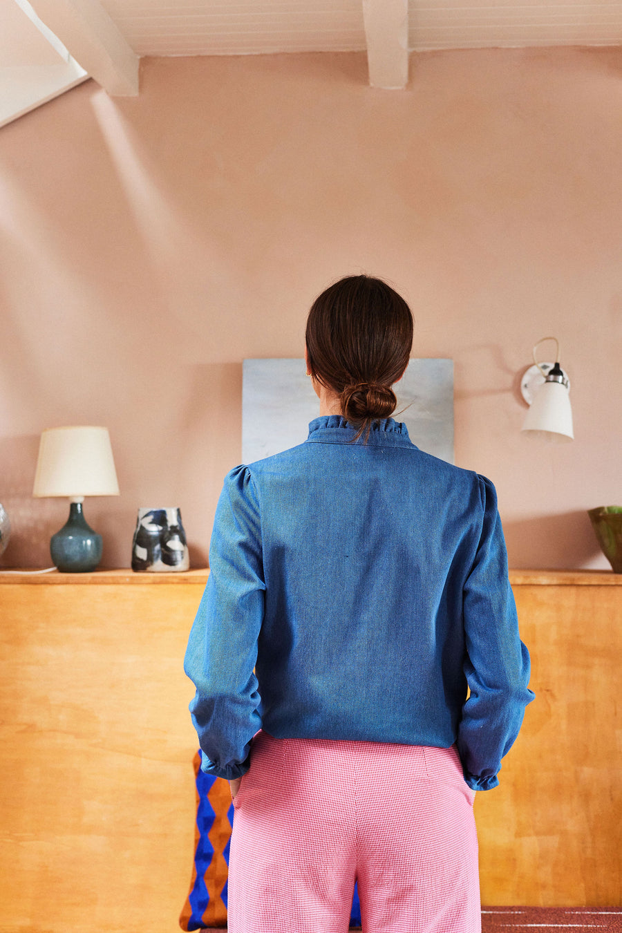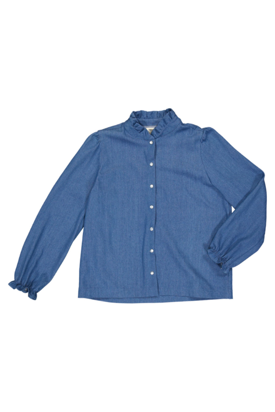 Alizée, chemise manches longues en denim avec un petit col montant et volanté, fermée par des pressions. Le basique de votre vestiaire Mesdames ! Version Denim.
