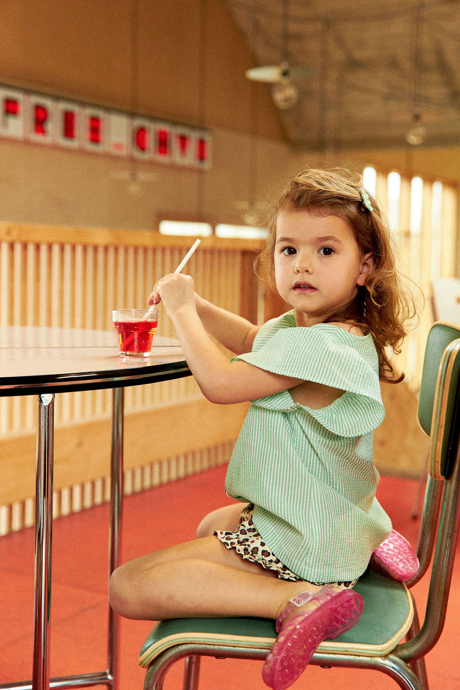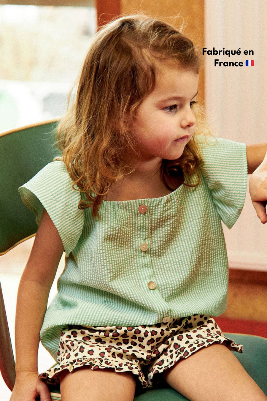 Camille le top fille est une blouse rayures vertes, encolure carrée et volants aux épaules. La pièce parfaite avec un jean, short ou une jupe.