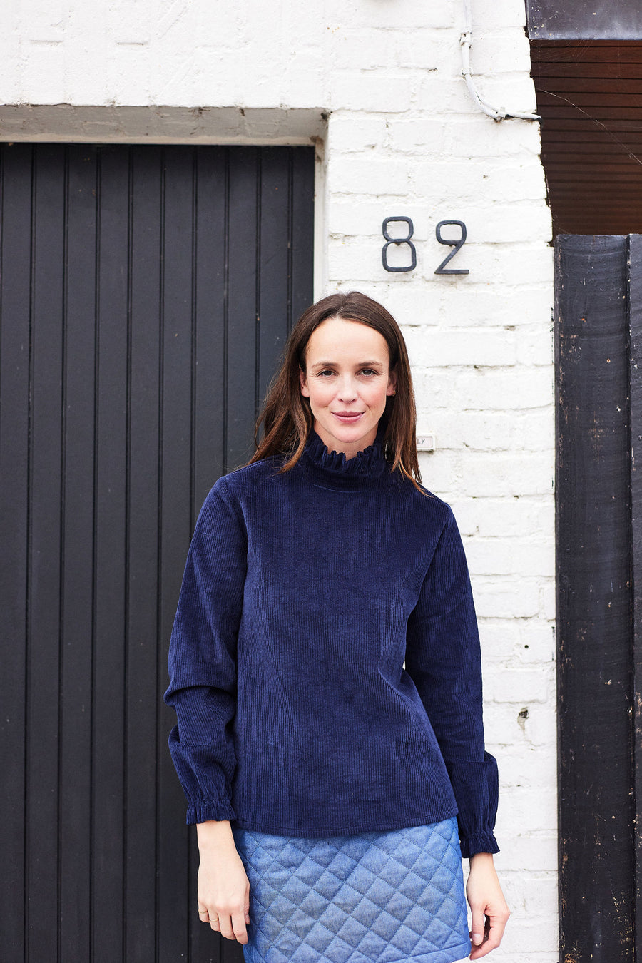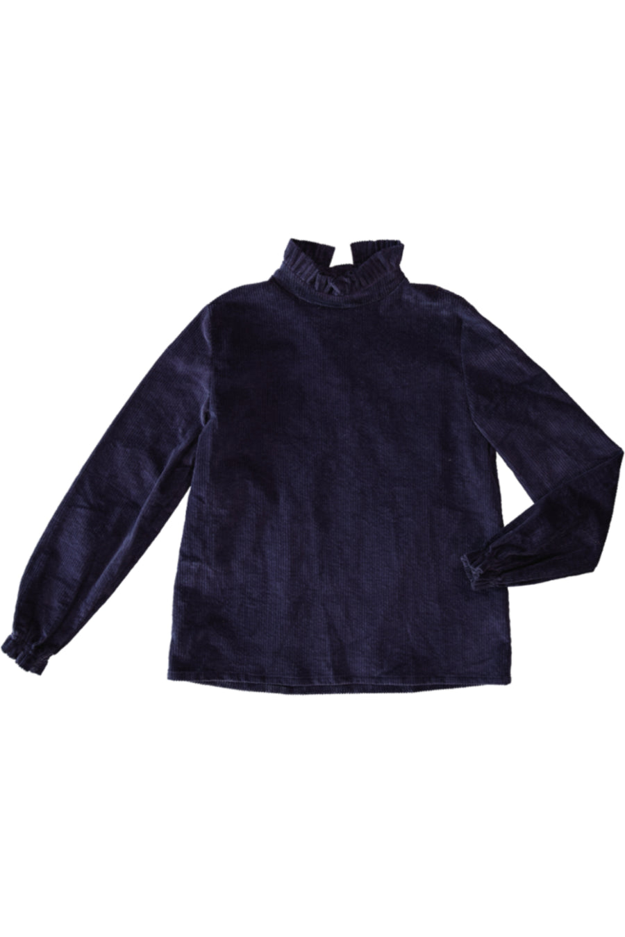 Daphnée est une chemise manches longues avec un petit col montant volanté dans un velours tout doux et confortable, fermée par des boutons en bois au dos. Une pièce iconique chez Frangin Frangine, facile à associer.