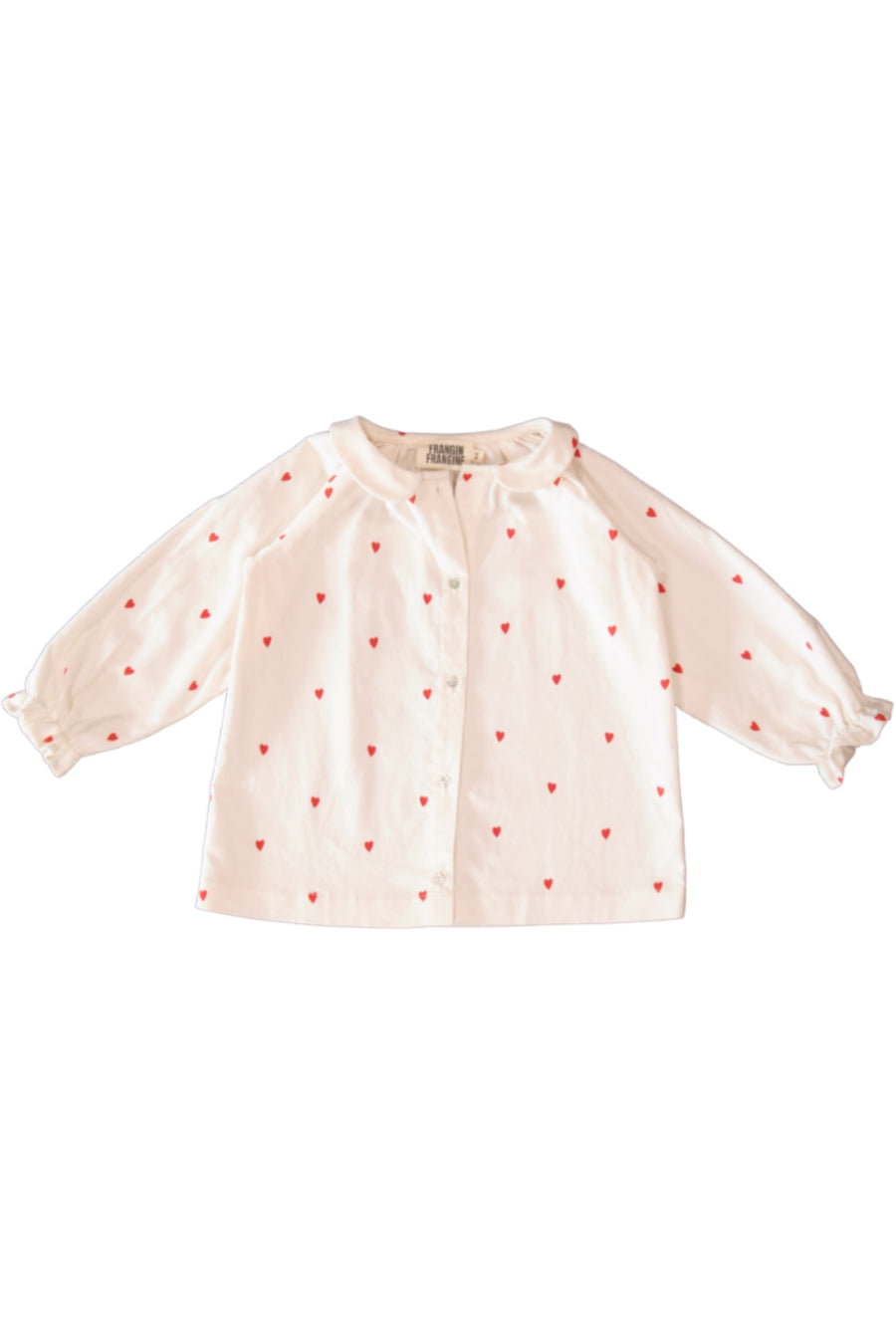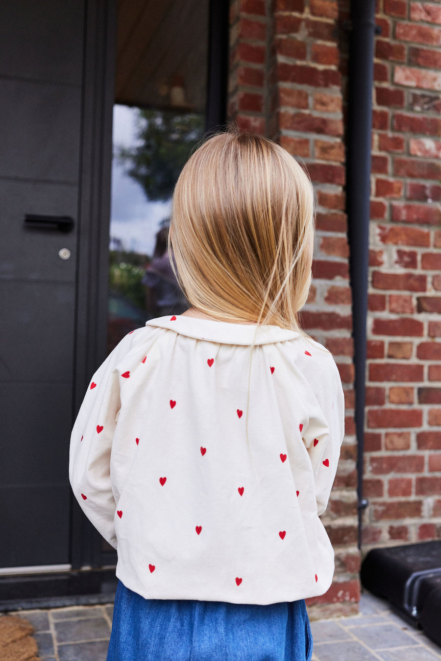 Coupe rétro parfaite pour notre nouveau chemisier Albertine. imprimé coeurs sur velours, manches longues blousantes et col Claudine. Cette blouse est la nouvelle pièce préférée de vos petites filles !