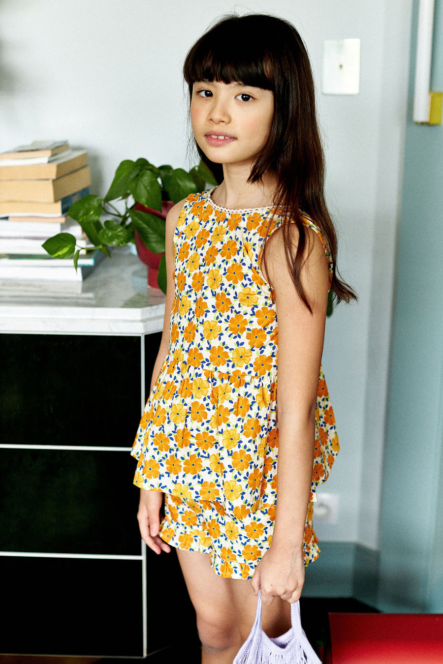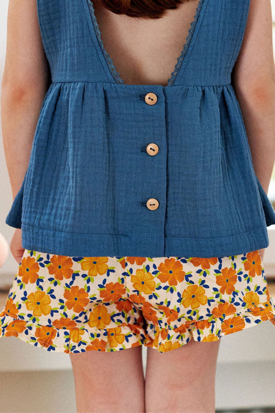 Marilou is the very practical shorts. Frilly cut, elastic waist and orange flower print, super bright. The basic that your minis will never leave this season.