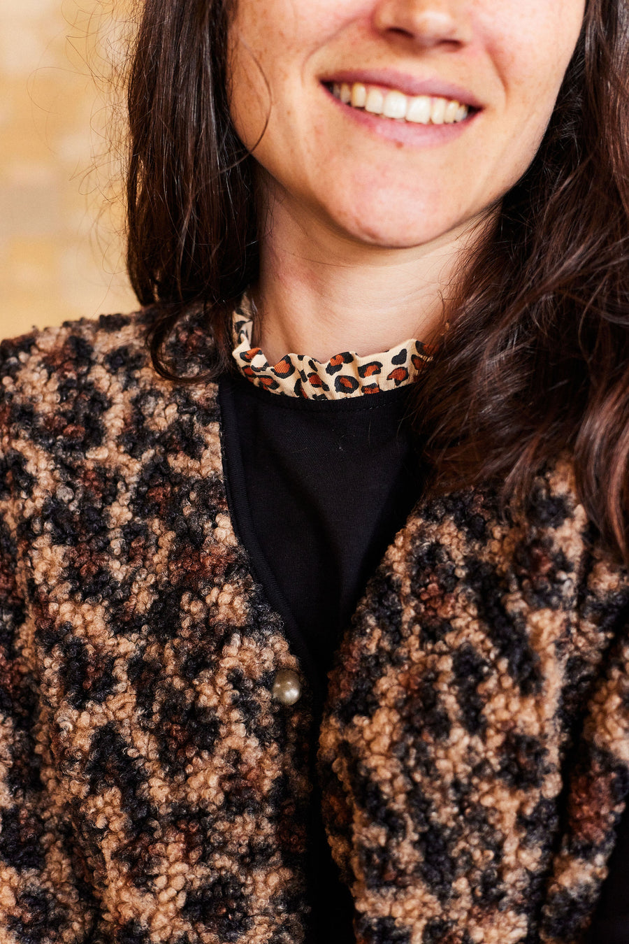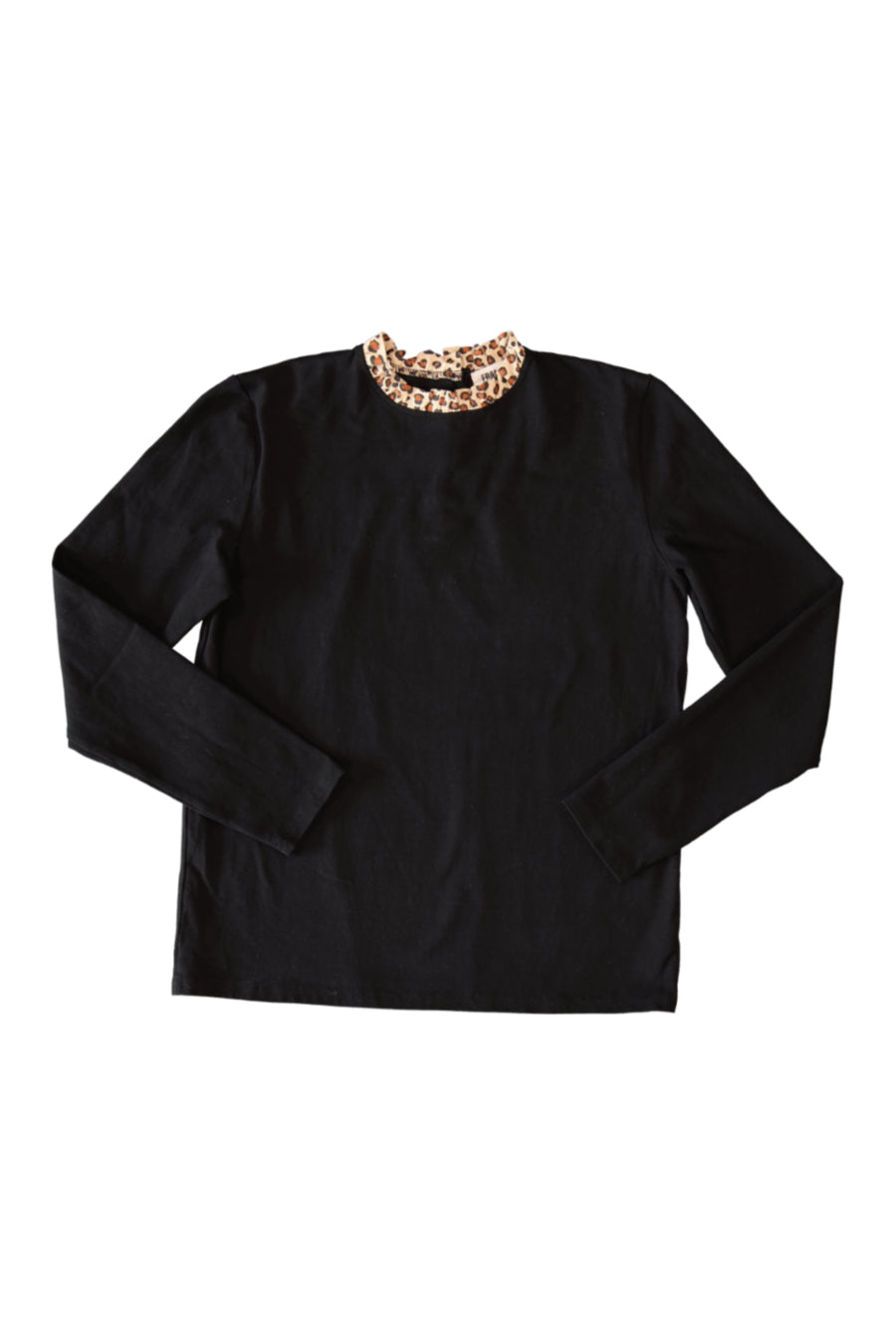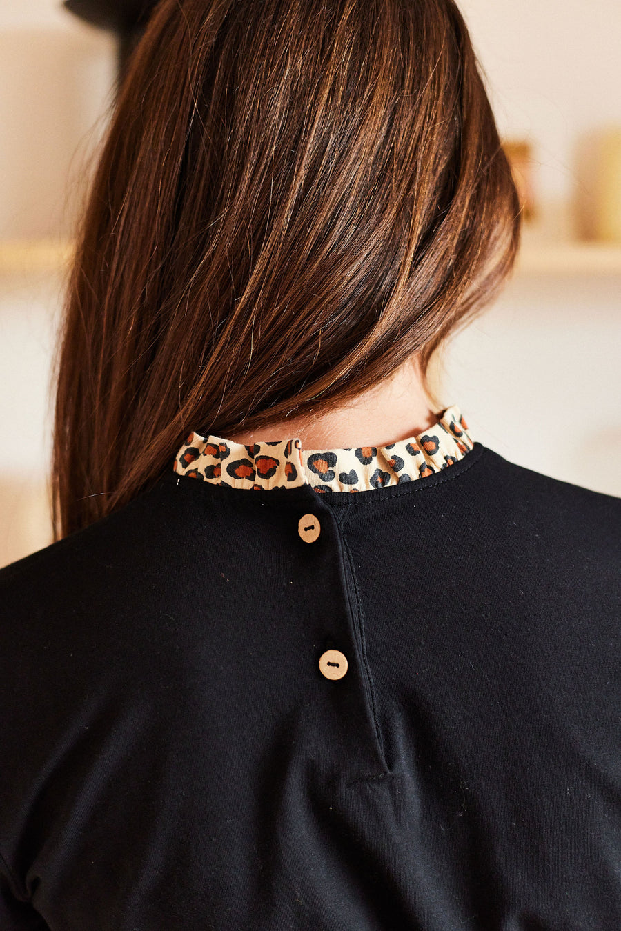 Nouvelle coupe ! Loulou est un t-shirt manches longues noir avec un petit col volanté imprimé léopard. Coup de coeur pour ce basique cool, élégant et tout doux. C'est LE t-shirt parfait pour la saison mesdames !