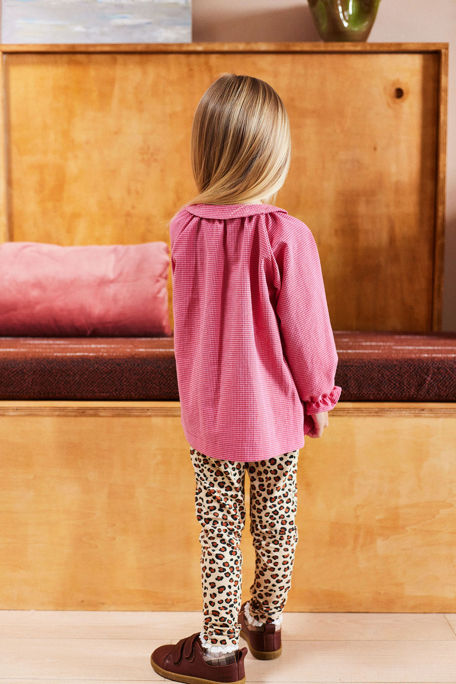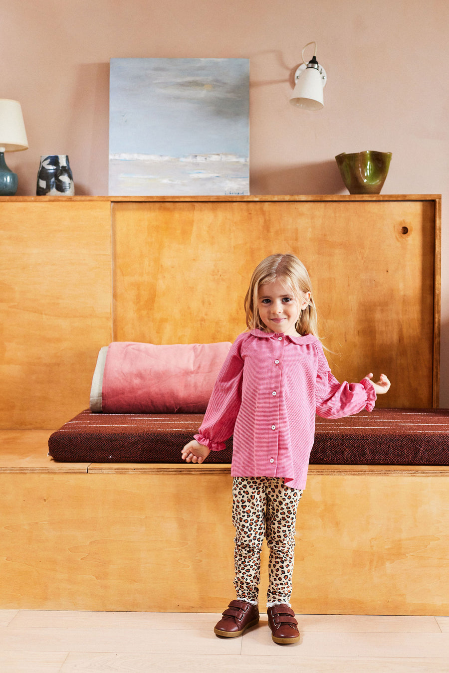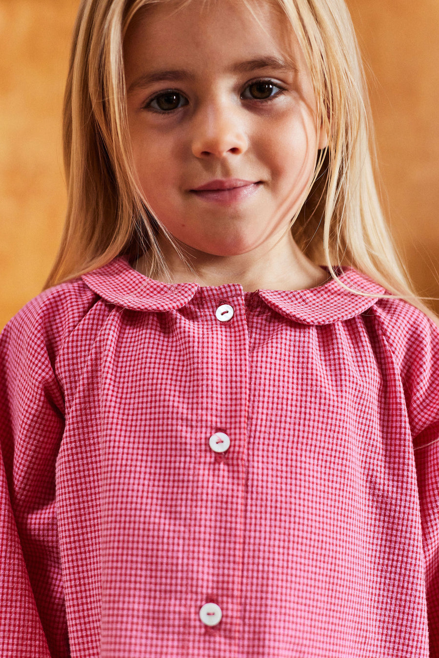 Coupe rétro parfaite pour notre nouveau chemisier Albertine. Micro vichy rose, toute douce, manches longues blousantes et col Claudine. Cette blouse est la nouvelle pièce préférée de vos petites filles !