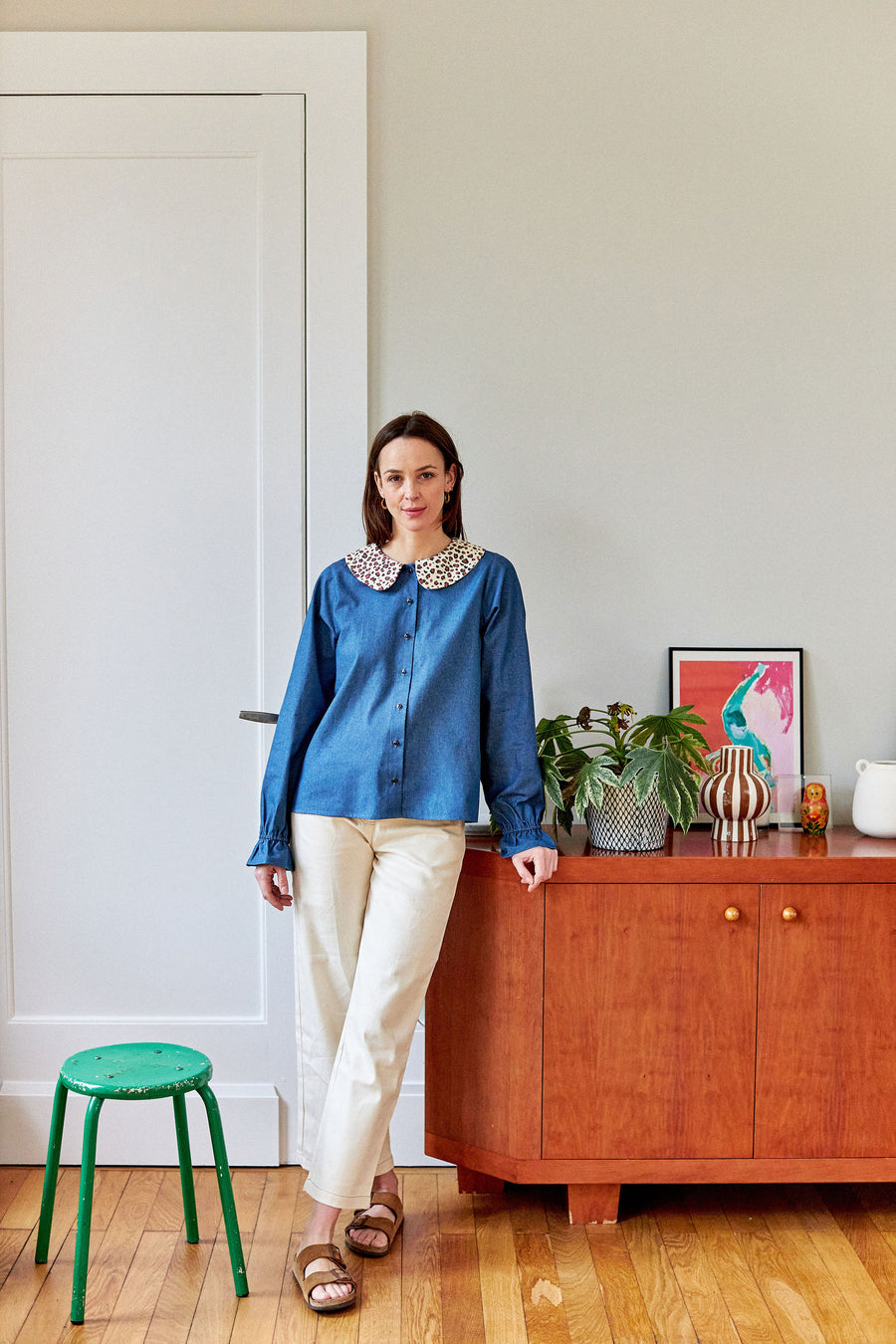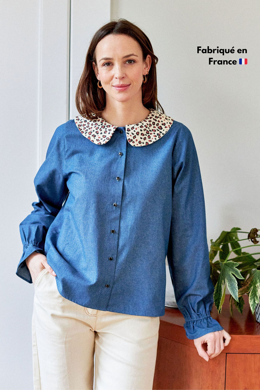 Nicole est une chemise manches longues en denim avec un grand col Claudine imprimé léopard, bas de manche élastiqué et volanté, fermée par des boutons. On adore cette pièce à la fois basique et cool, que l'on porte toute la saison.