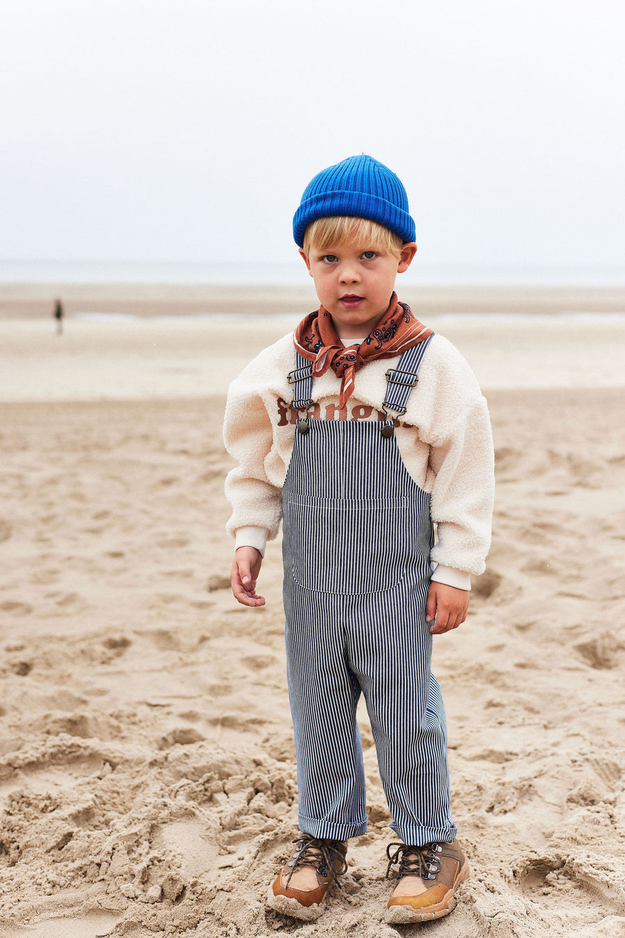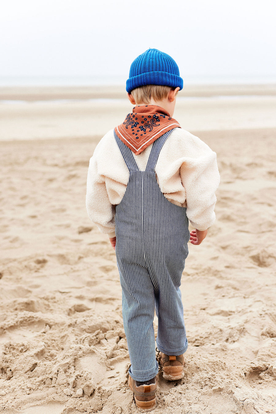 Eliette est une salopette longue, en rayures marine, avec attaches métalliques ajustables. Une poche plaquée devant sur une coupe mixte qui se transmet de génération en génération. Version rayures marine.