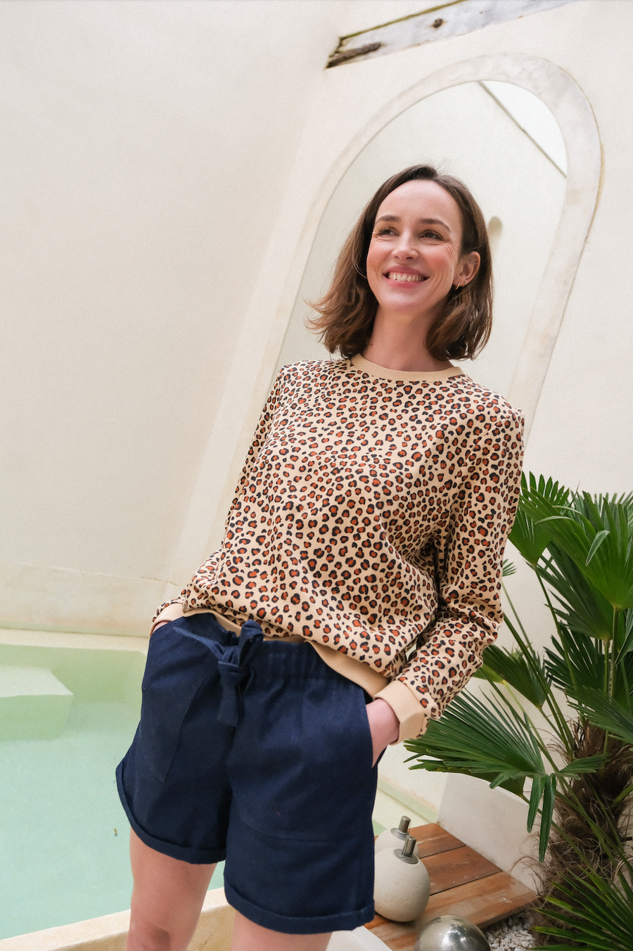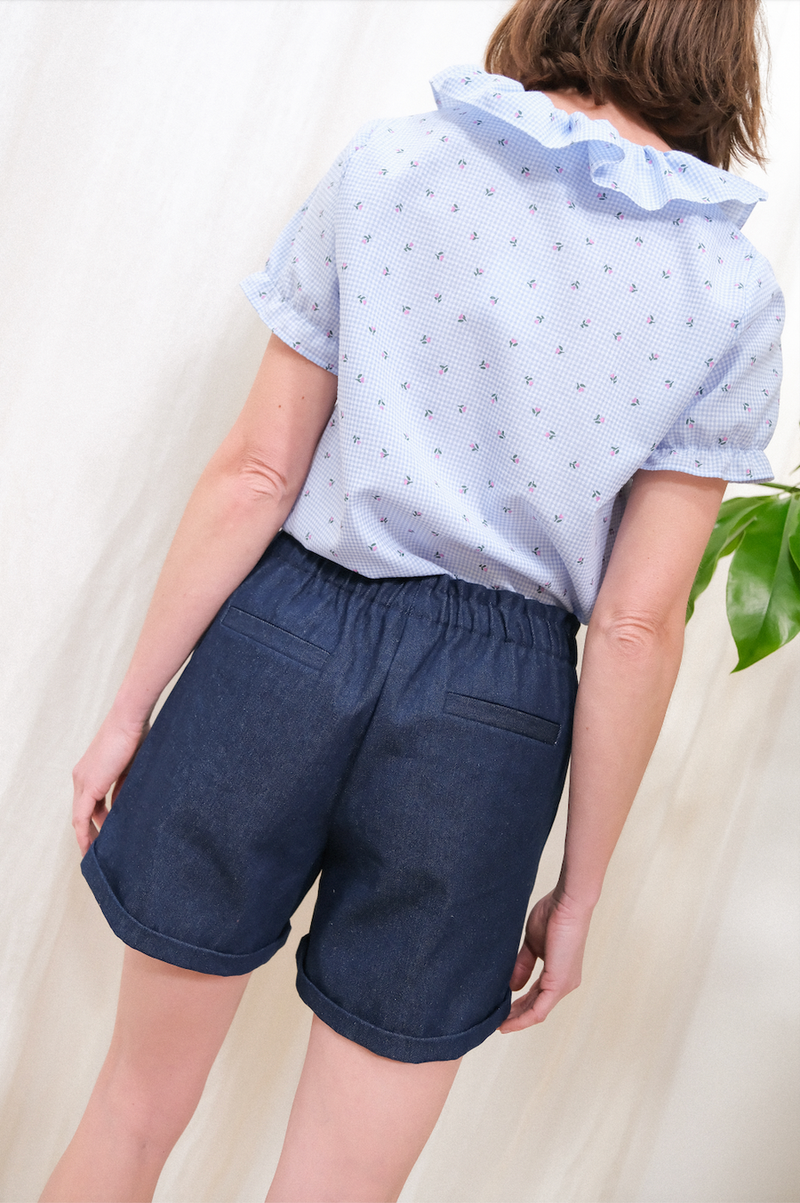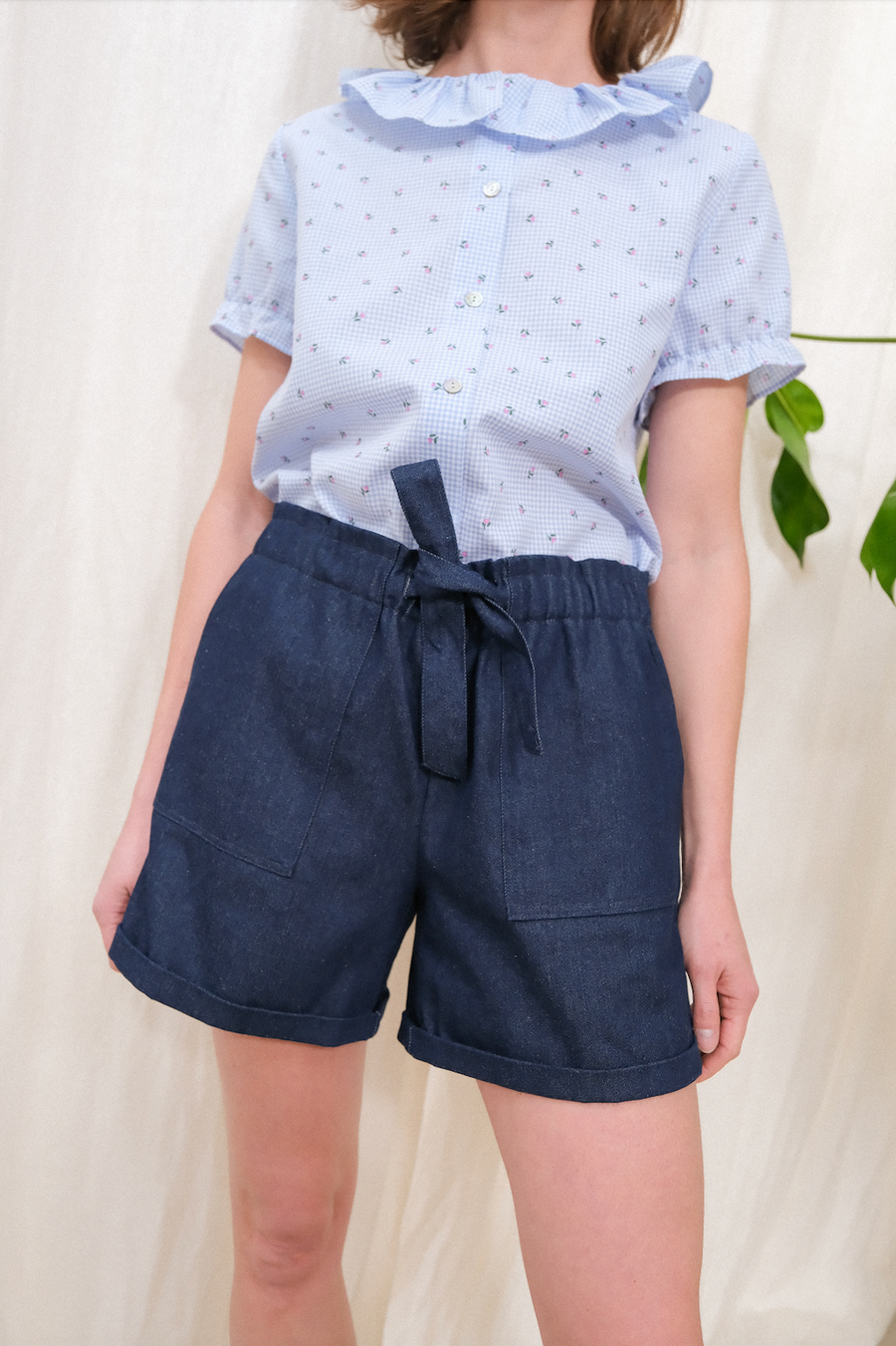 Sybille est un short en denim, taille haute, élastique et fermé par un noeud. C'est la pièce pratique avec ses 2 poches sur les côtés, et qu'on ne quitte plus de l'été.